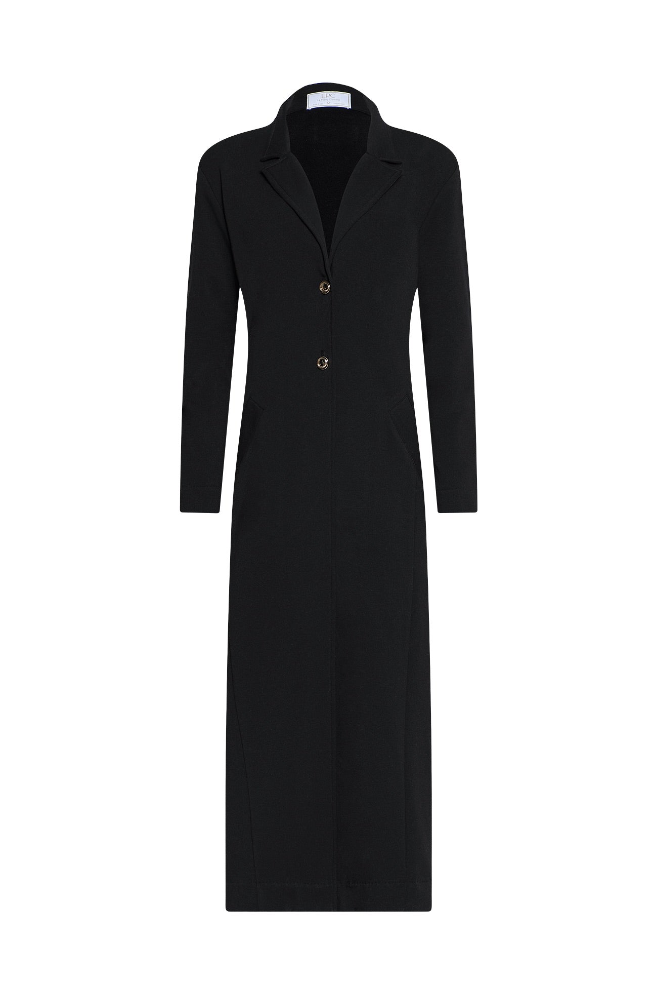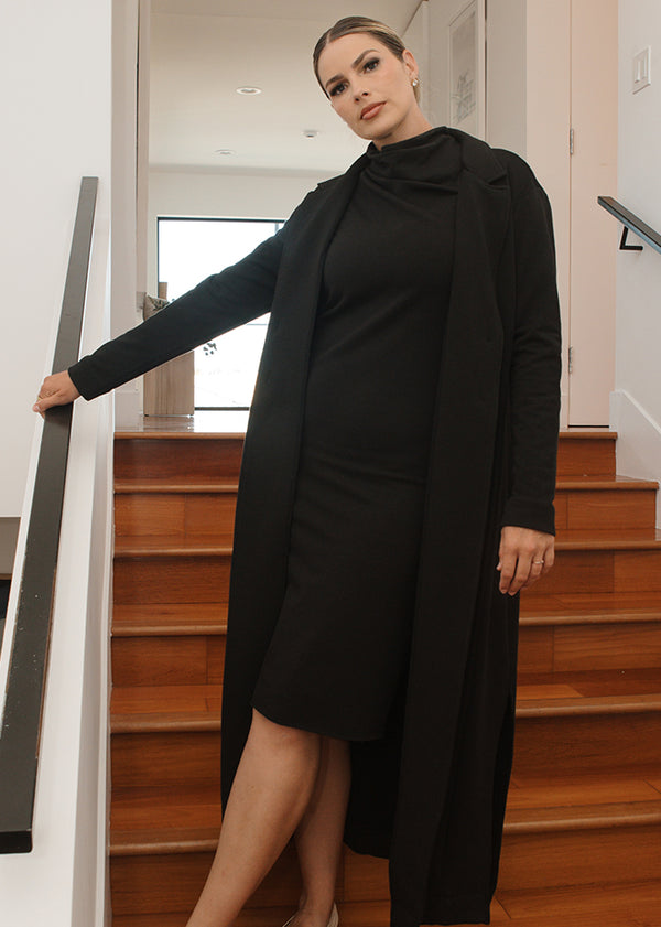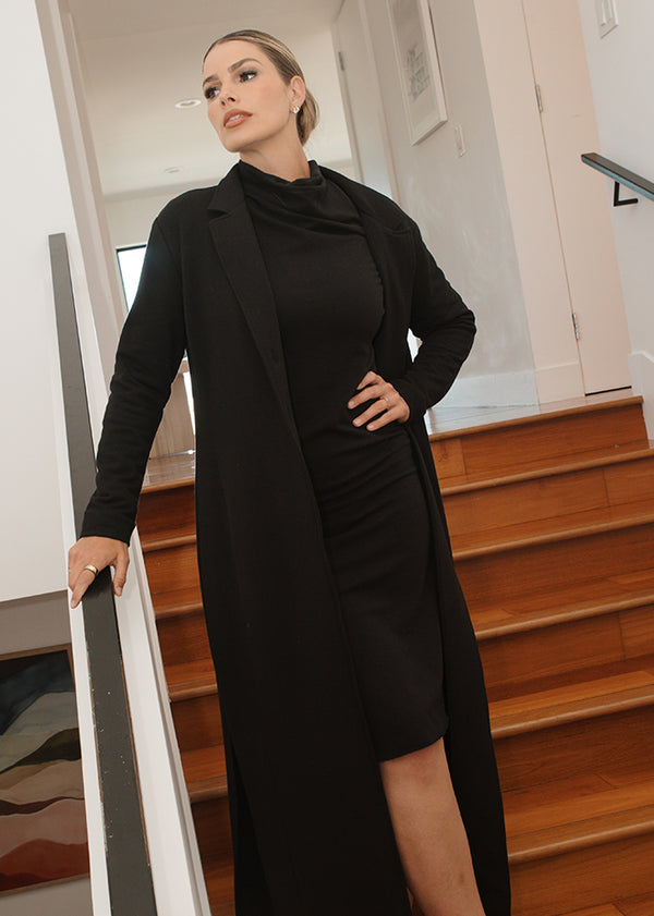 Elegance meets comfort with this gorgeous outerwear layer - The Genevieve.  Crafted from our signature fleece lined modal cotton blend with a touch of spandex, this easy style offers a fluid drape and gentle stretch for ease of movement.  The long, streamlined silhouette features refined details - two gold buttons in front, subtle side slits at the knee for graceful flow, and a classic lapel neckline.