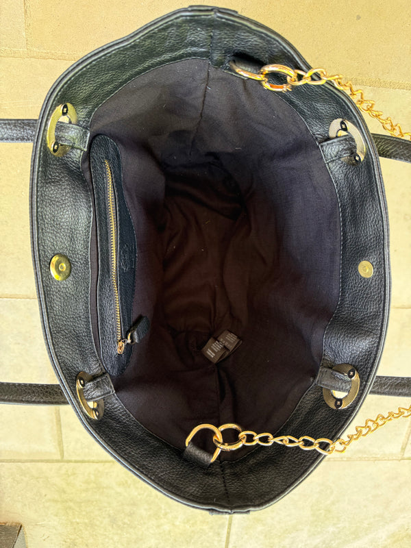 Designed for versatility, it features an easy snap closure, a leather-trimmed interior zip pocket, and a soft cotton lining for a refined touch. Gold-tone metal feet protect the leather base, while a long gold chain offers the option to wear it as a cross body for effortless styling. A handcrafted leather pom-pom detail adds the perfect finishing touch, celebrating the artistry behind every piece.