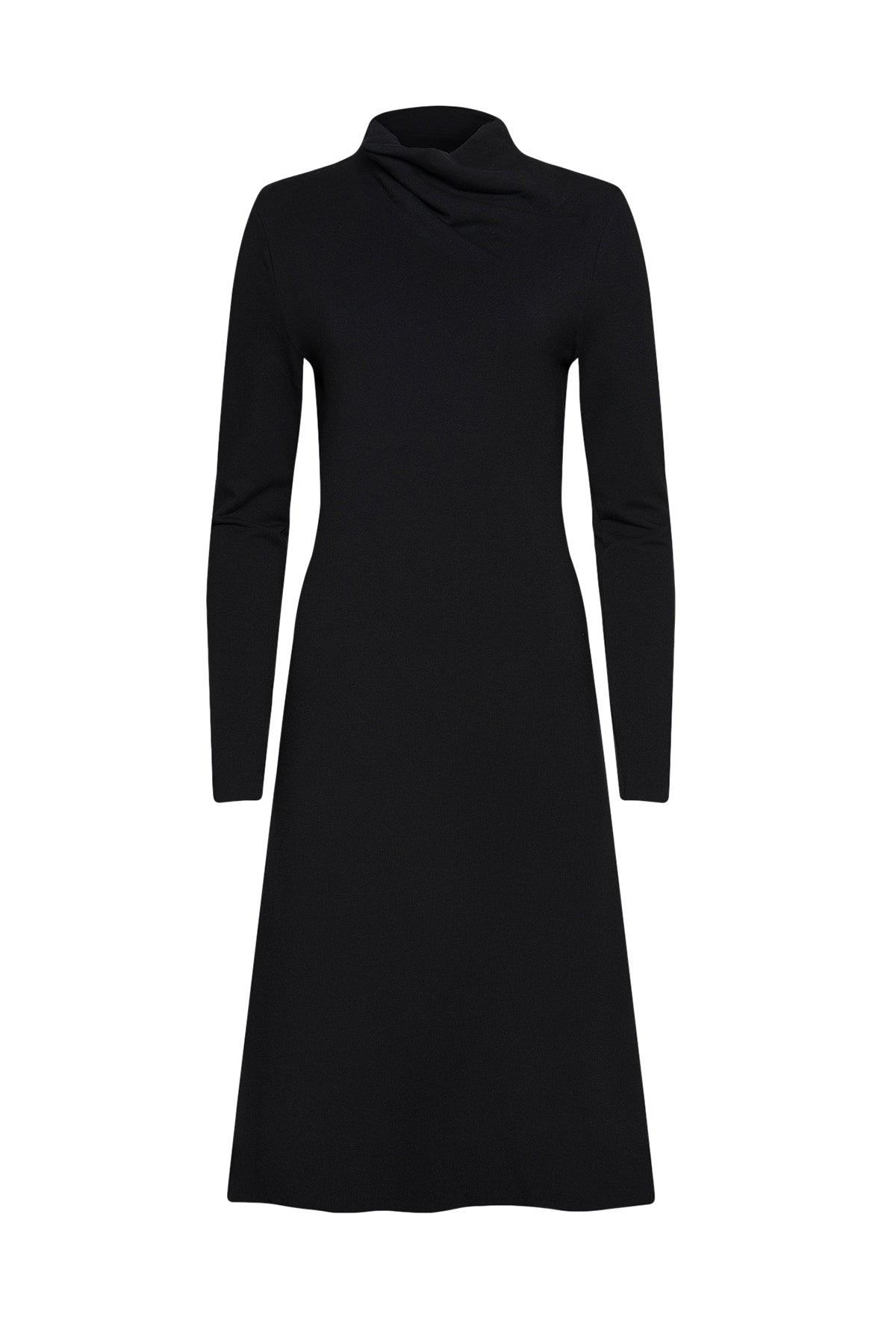The oversized mock neck drapes beautifully with a soft, cowl-like effect, adding a touch of refined drama to the silhouette. Cut in a flattering A-line shape that floats away from the body, the Margaret Dress combines ease and sophistication. Finished with raw hems and long sleeves, its midi length makes it a versatile piece that transitions seamlessly from cozy days at home to polished outings and evening gatherings.