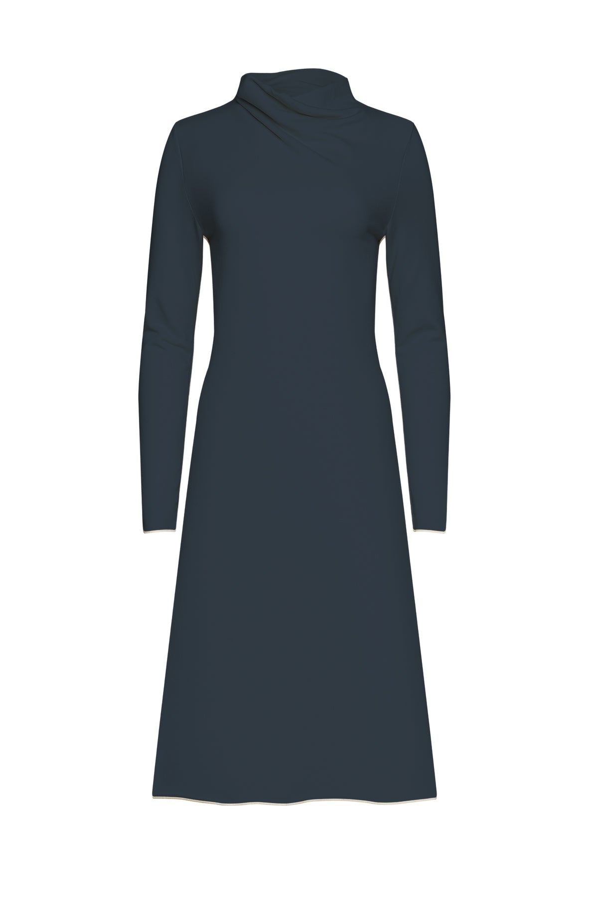 The oversized mock neck drapes beautifully with a soft, cowl-like effect, adding a touch of refined drama to the silhouette. Cut in a flattering A-line shape that floats away from the body, the Margaret Dress combines ease and sophistication. Finished with raw hems and long sleeves, its midi length makes it a versatile piece that transitions seamlessly from cozy days at home to polished outings and evening gatherings.