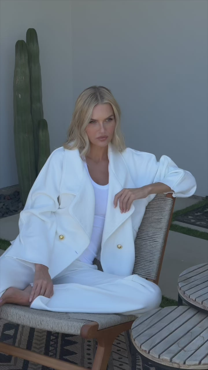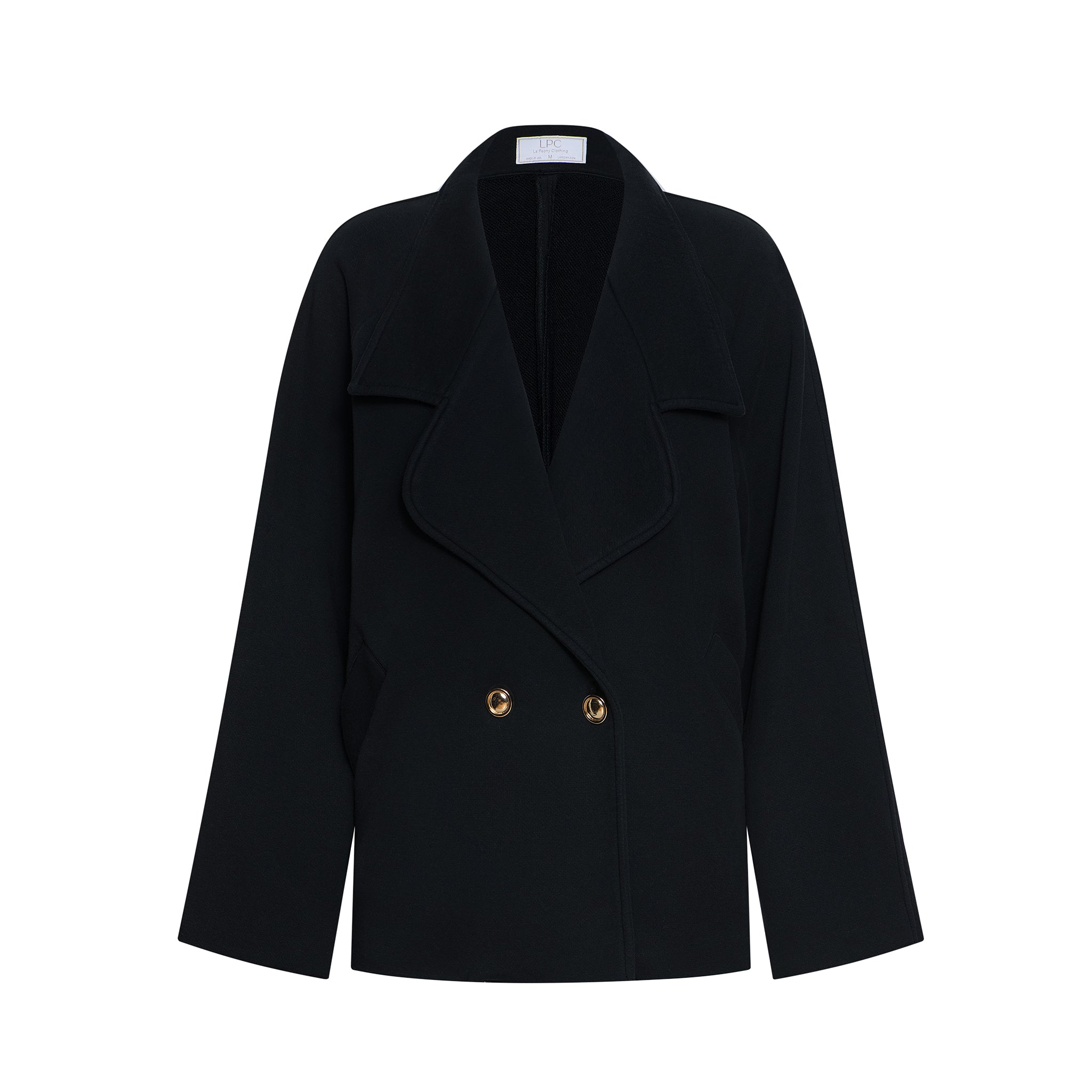 A modern essential with timeless appeal, The Vivienne Jacket is an intentionally oversized double-breasted jacket designed for effortless sophistication. Featuring raglan sleeves for ease and comfort, an exaggerated lapel for bold structure, and faux gold buttons that add a refined, polished finish, this jacket brings elevated tailoring to everyday wear. Finished with front welt pockets, it balances form and function with ease.